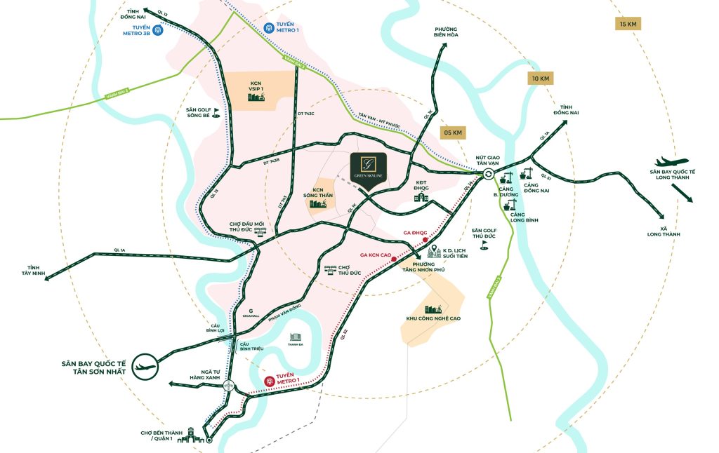 Căn hộ Green Skyline chiếm vị trí chiến lược tại giao lộ Quốc lộ 1K và đường GS1, phường Đông Hòa, một trong những trục hành lang giao thương quan trọng của Dĩ An.