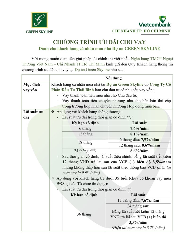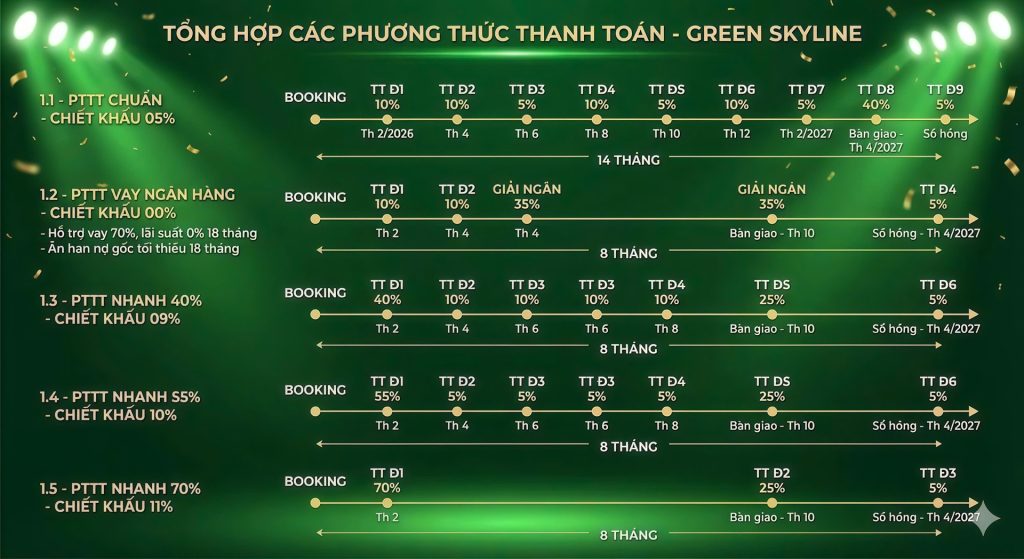 Green Skyline mang đến chính sách thanh toán linh hoạt và các chương trình ưu đãi giá trị, giúp khách hàng dễ dàng sở hữu căn hộ: